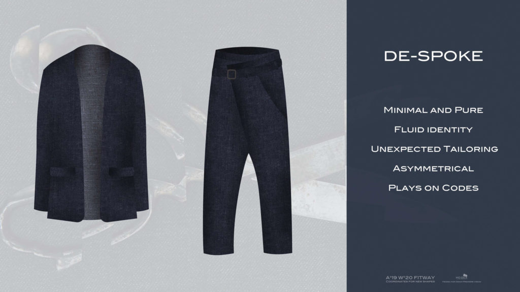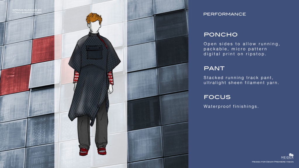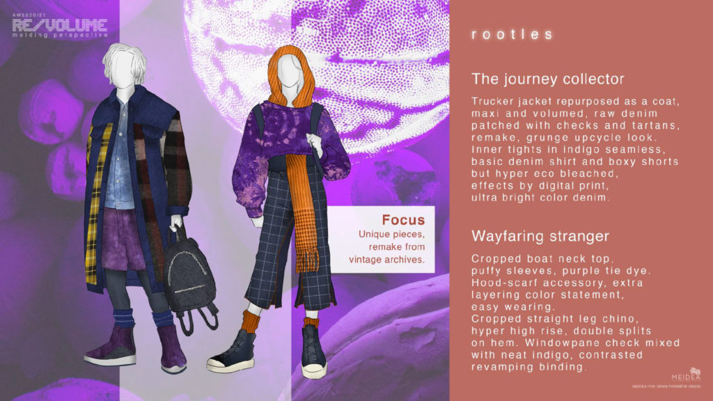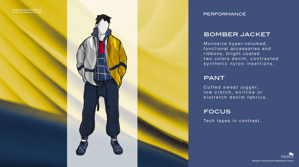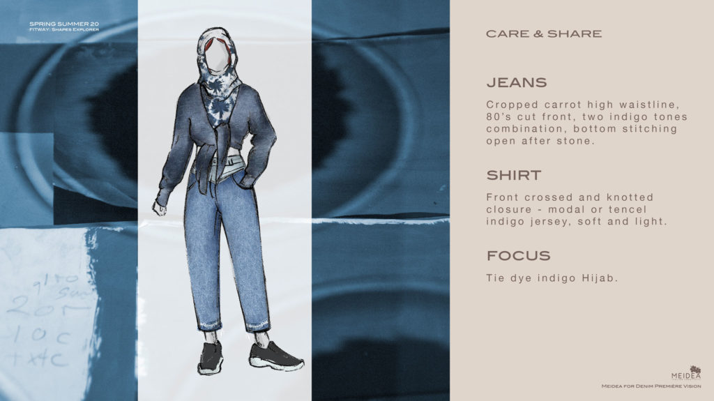 Gli outfits disegnati a mano dal nostro Team sono stati elaborati in illustrazioni digitali con l’inserimento di texture tessuti, dettagli e finiture legate per estetica, concetto e colore al concept generale. Durante questo seminario sui trend nel mondo del denim per la stagione spring/summer 2020, Lucia Rosin ha presentato ogni outfits suddivisi in 4 temi principali: CARE&SHARE, DISCOVER, PERFORMANCE, PERSONALIZATION. Ogni figurino è accompagnato dalle parole chiave, foto di mood di ricerca provenienti dall’archivio Meidea.