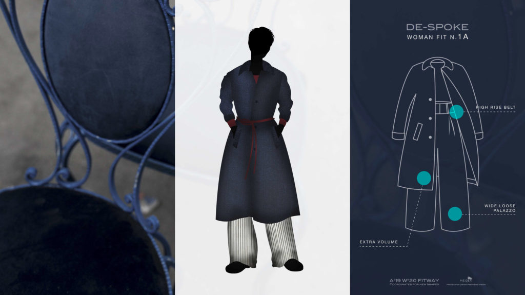 Gli outfits disegnati ad elaborati digitalmente dal nostro Team sono contestualizzati nel concept generale attraverso la suddivisione in 5 temi di tendenza. Ogni figurino è accompagnato dalle parole chiave, foto di mood di ricerca personale e focus dei dettagli stilistici dei capi d’abbigliamento.