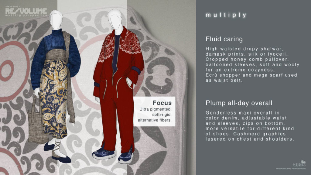 Il team di Meidea si è confrontato con il team di Denim Première Vision in ogni fase dello sviluppo per essere allineati nei concetti generali delle tendenze, le cartelle colori e parole chiave da integrare nelle presentazioni sviluppate nel corso di questi 3 anni di lavoro di squadra.