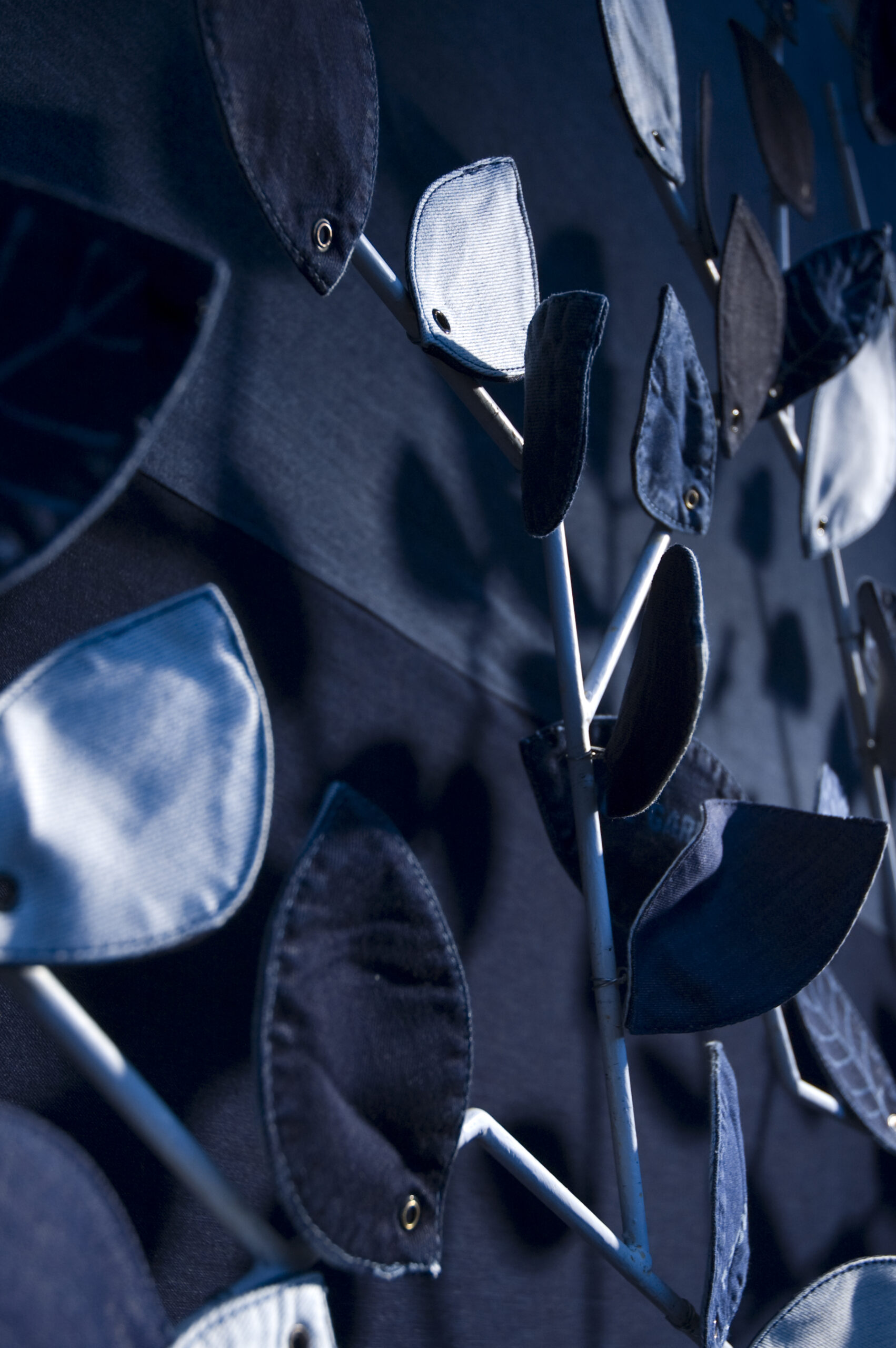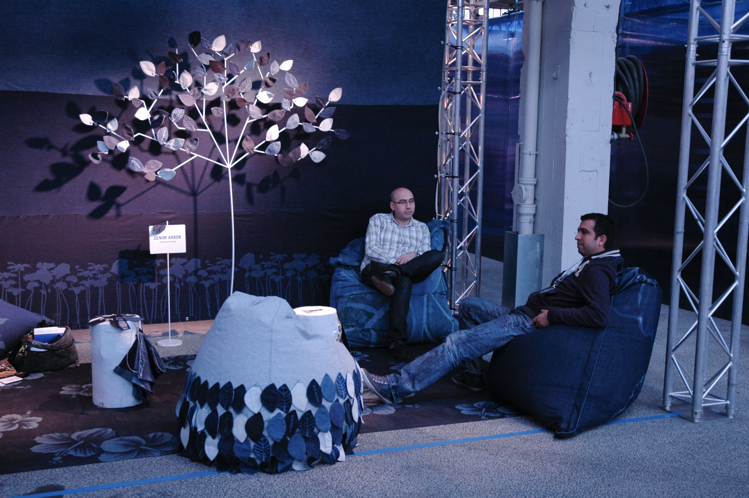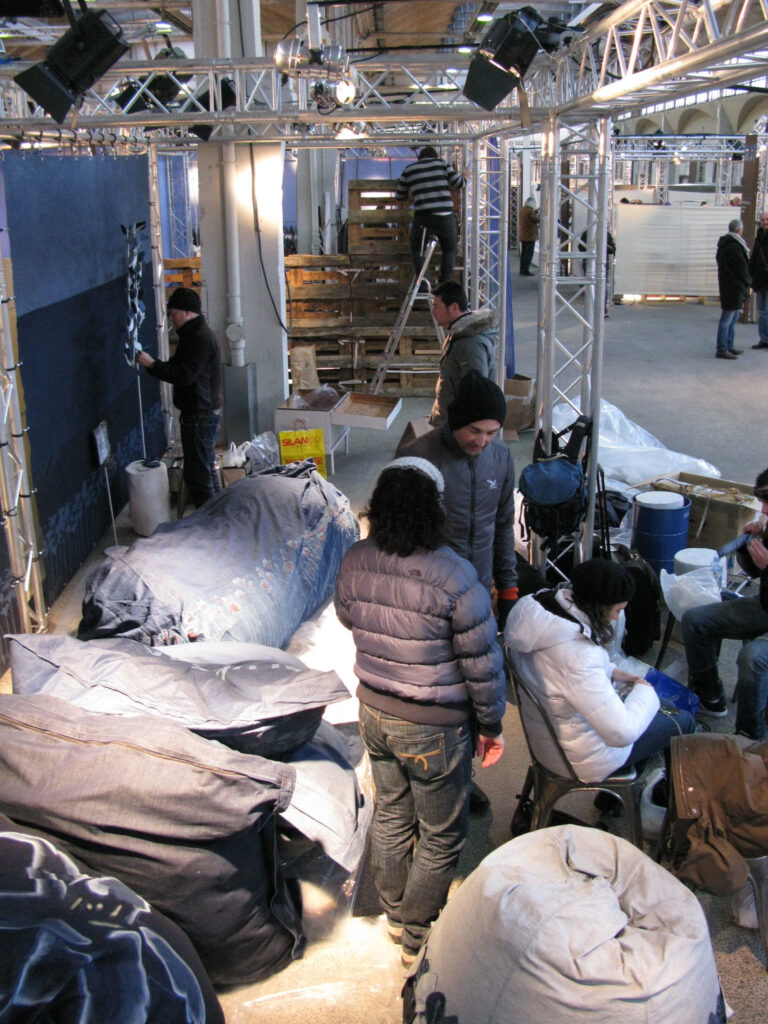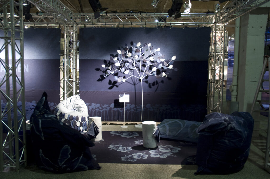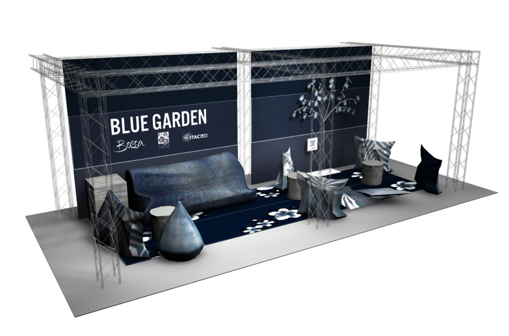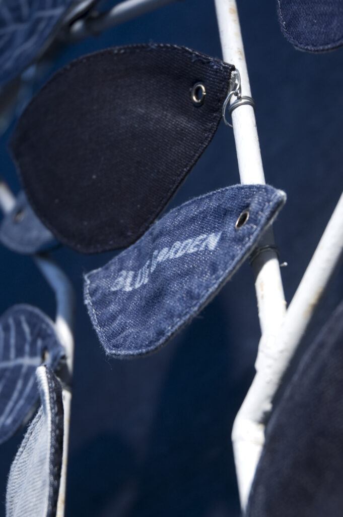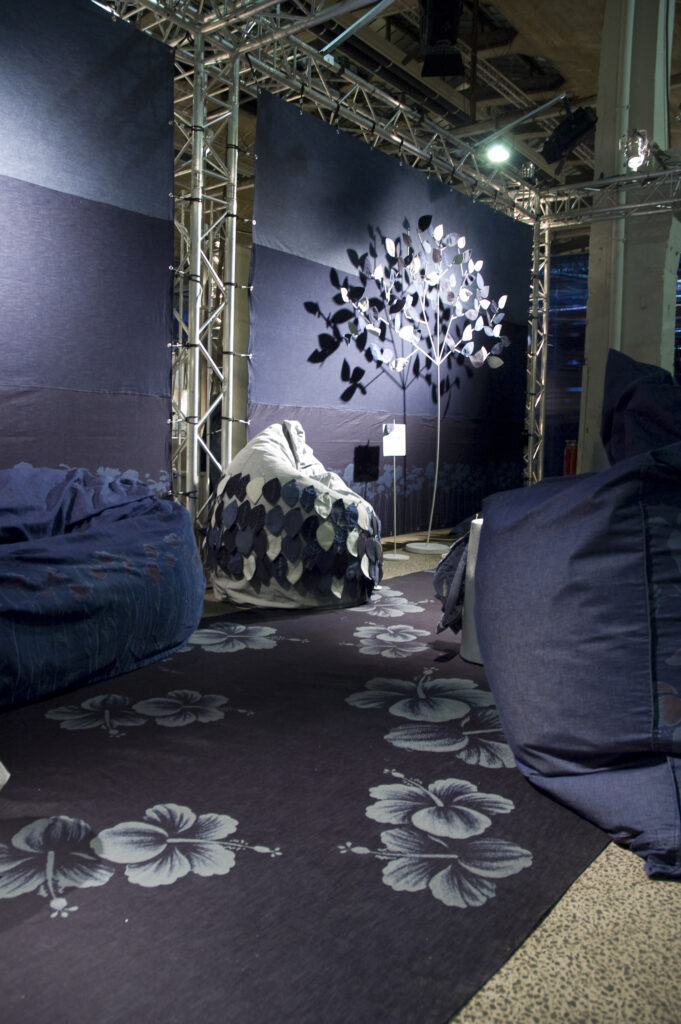 Questa collaborazione ha portato alla creazione di una area relax eco-friendly, dove non solo l’aspetto di un giardino ma anche i materiali e le tecniche utilizzate trasmettessero l’amore e il rispetto che portiamo alla natura. Tutto è stato realizzato in denim organico, dalla coltivazione del cotone alla tintura, e decorato con innovative tecniche laser e colori organici (questi ultimi a mano direttamente nel nostro studio).