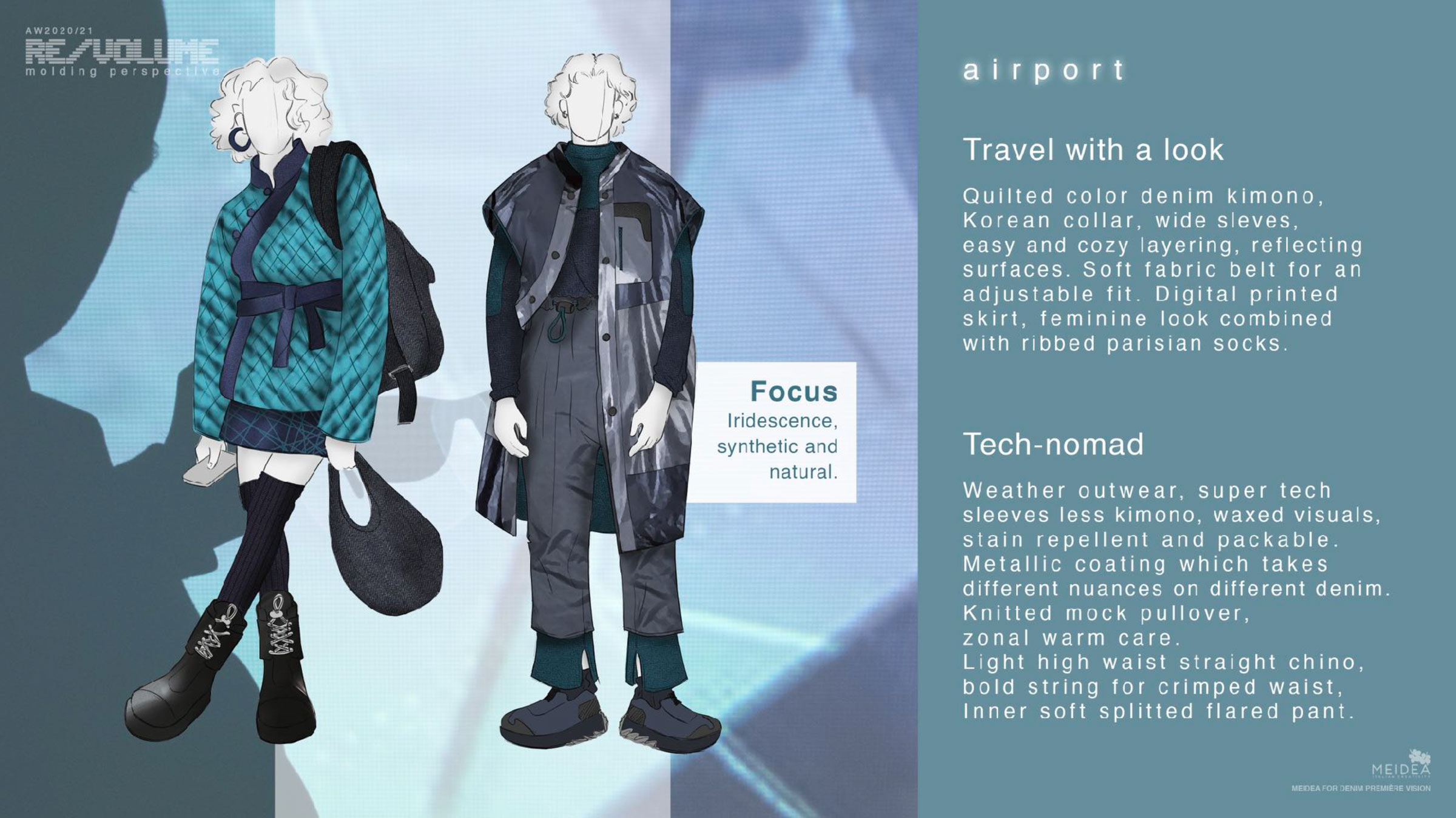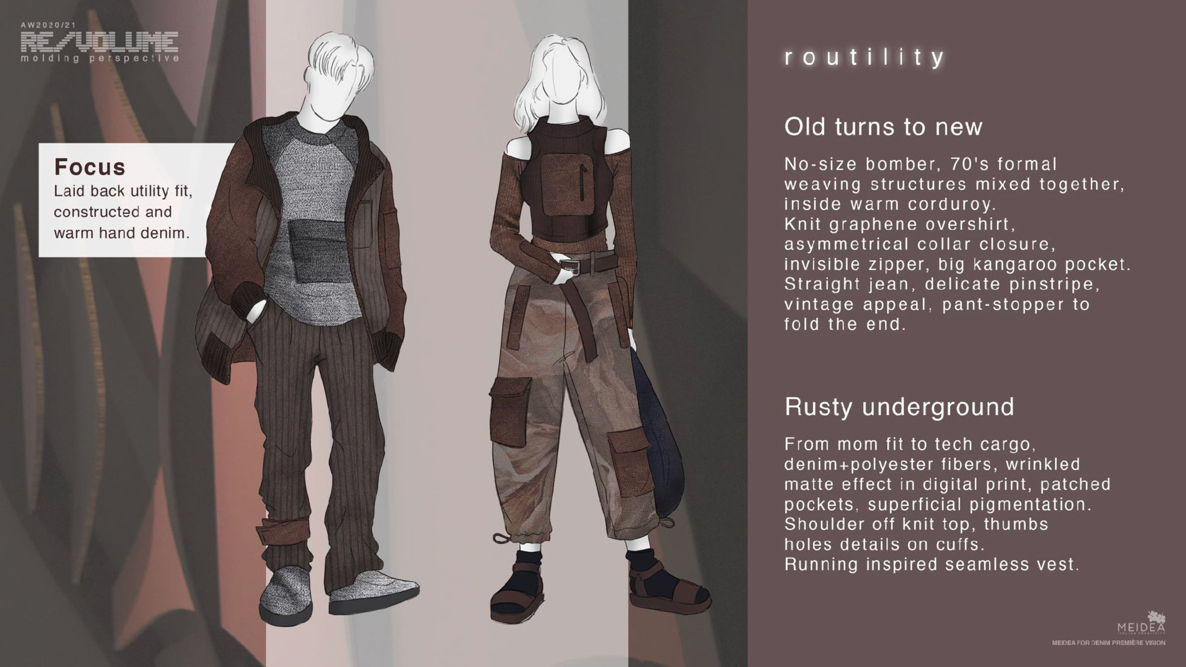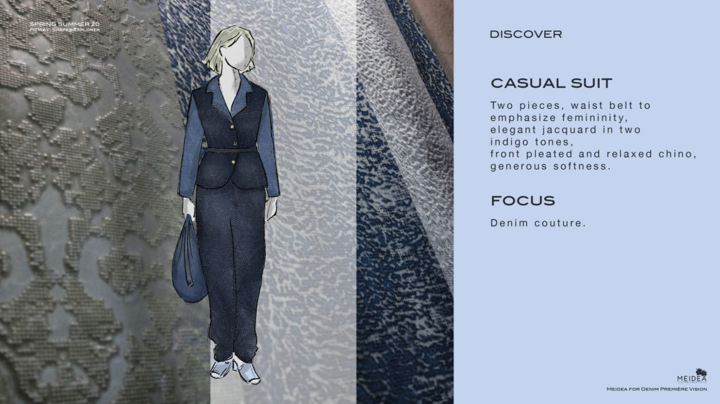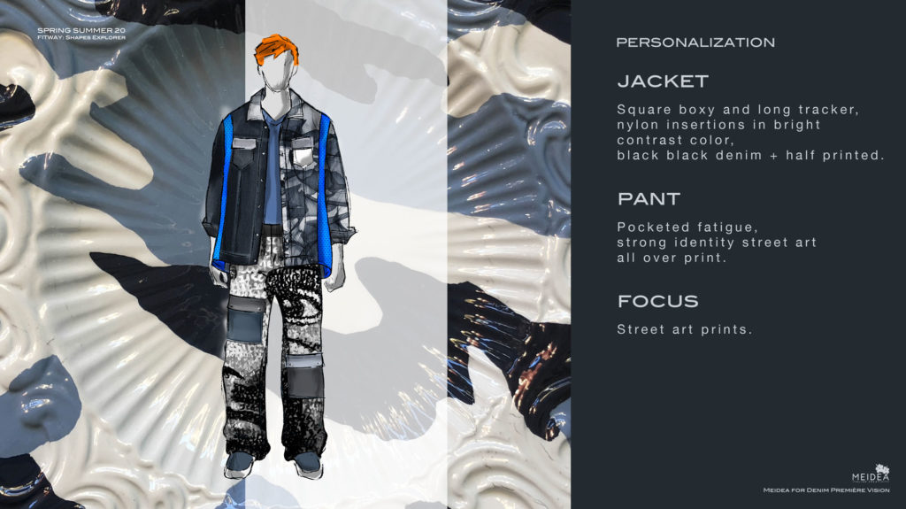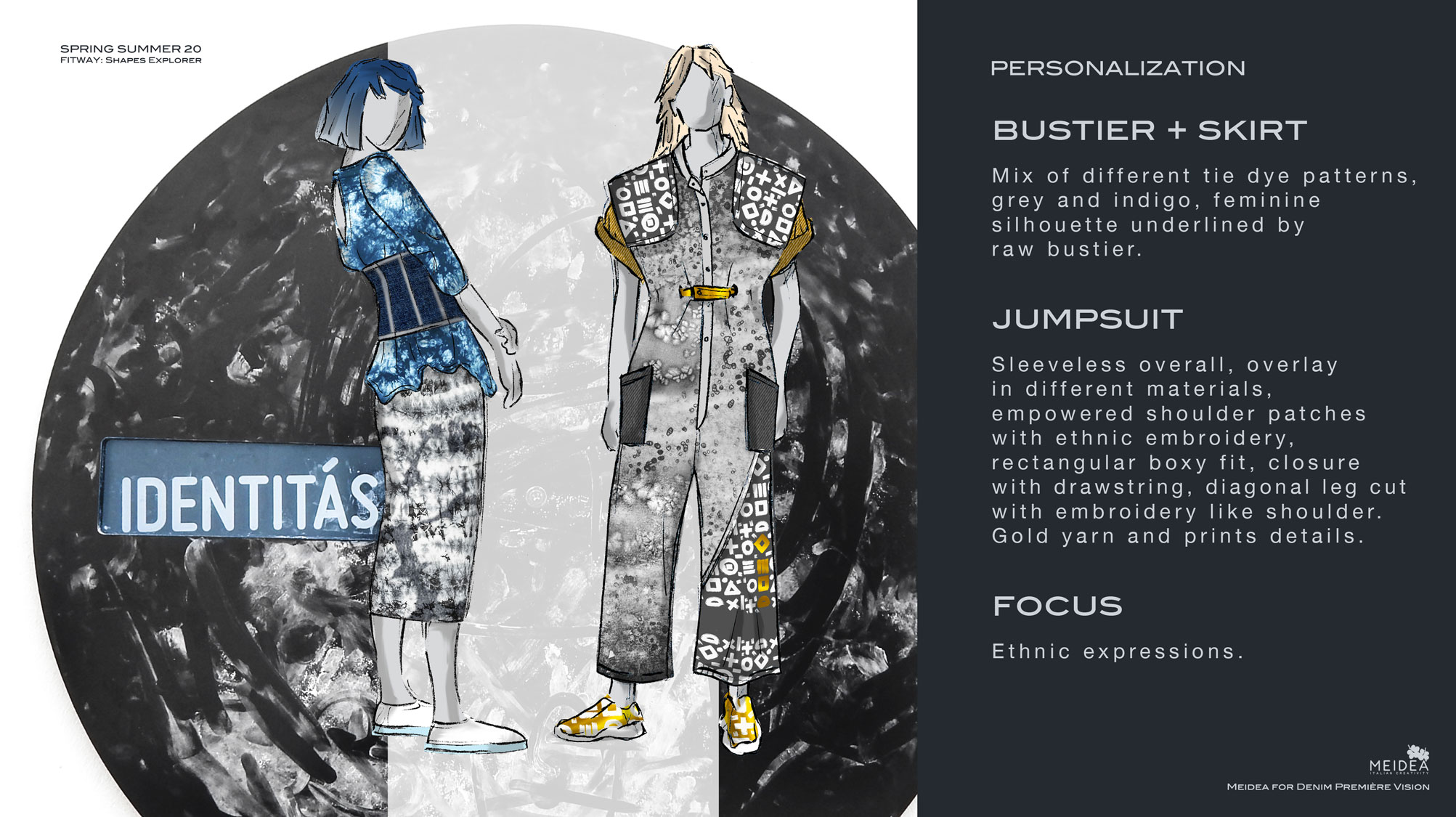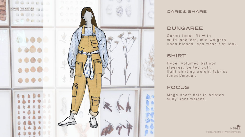 Gli outfits disegnati a mano dal nostro Team sono stati elaborati in illustrazioni digitali con l’inserimento di texture tessuti, dettagli e finiture legate per estetica, concetto e colore al concept generale. Durante questo seminario sui trend nel mondo del denim per la stagione spring/summer 2020, Lucia Rosin ha presentato ogni outfits suddivisi in 4 temi principali: CARE&SHARE, DISCOVER, PERFORMANCE, PERSONALIZATION. Ogni figurino è accompagnato dalle parole chiave, foto di mood di ricerca provenienti dall’archivio Meidea.