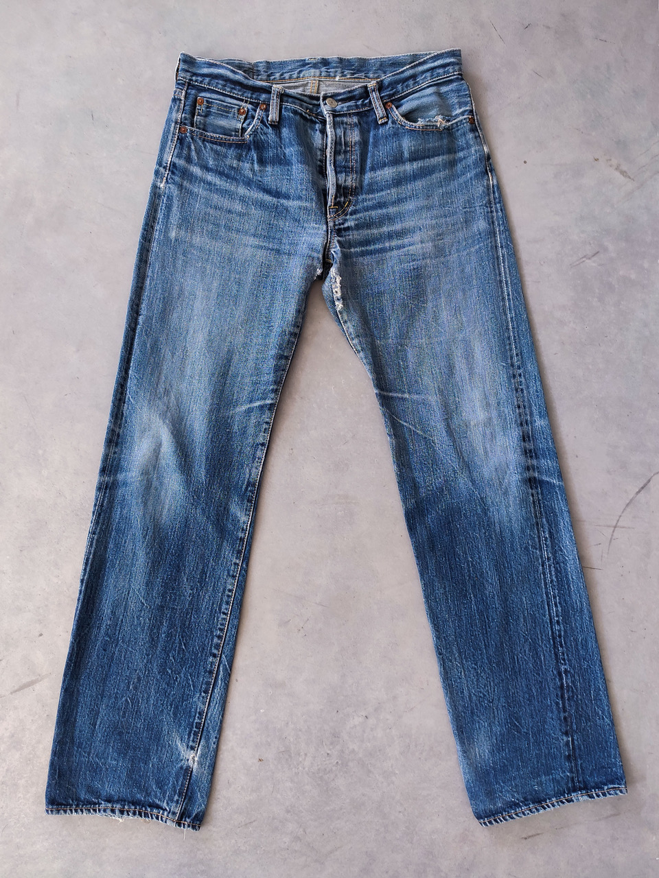 Un bellissimo denim indaco puro da 14 once che ho usato e uso ancora per il giardinaggio. Questa foto è stata scattata circa 10 anni fa, l’ho scattata nel mio giardino, circondato dalle rose che sono la mia passione, il danno alla tasca posteriore dei jeans è stato fatto con delle forbici, ma il tessuto resiste benissimo anche dopo tanti anni; i jeans possono durare una vita intera.