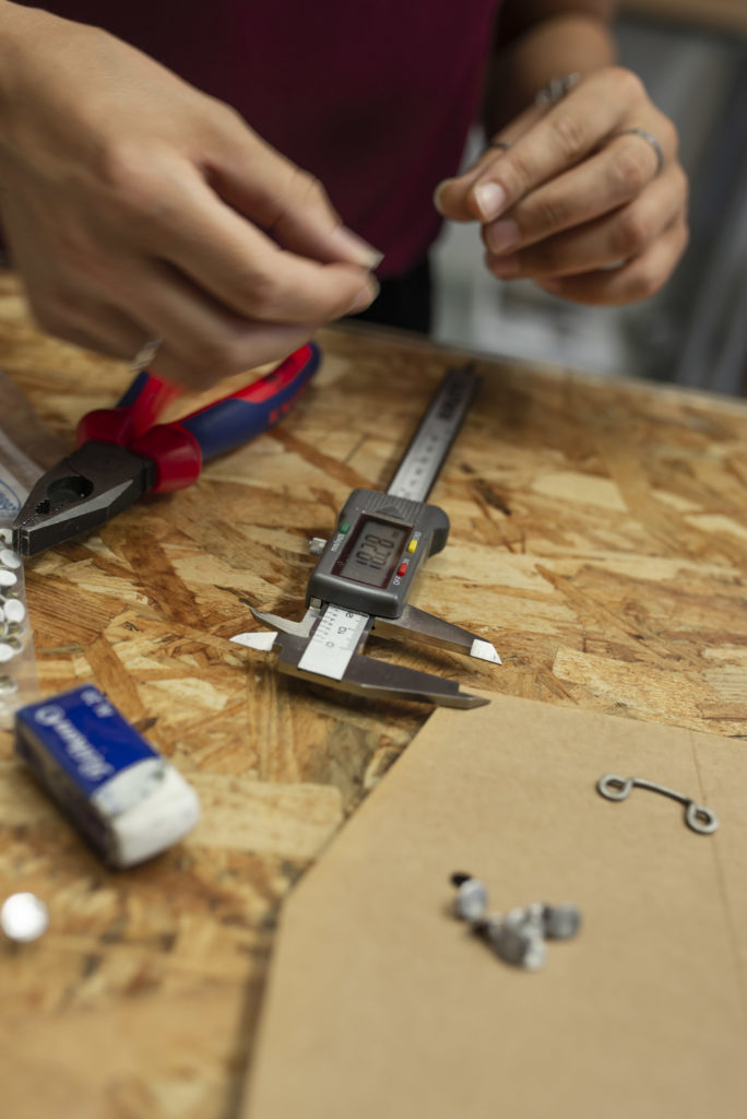 The packaging of the outfits has been completed and we can move on to the application of accessories and final treatments. It starts at 6 am with Lucia marking the position of all the buttons and dividing the garments by type of accessories and dyeing. At 1 pm the suitcases are loaded into the car together with the photographic equipment: direction Spring 85 which followed the production of all the tack, pressure and rivet buttons for the THE CIRCLE BOOK 2 collection.