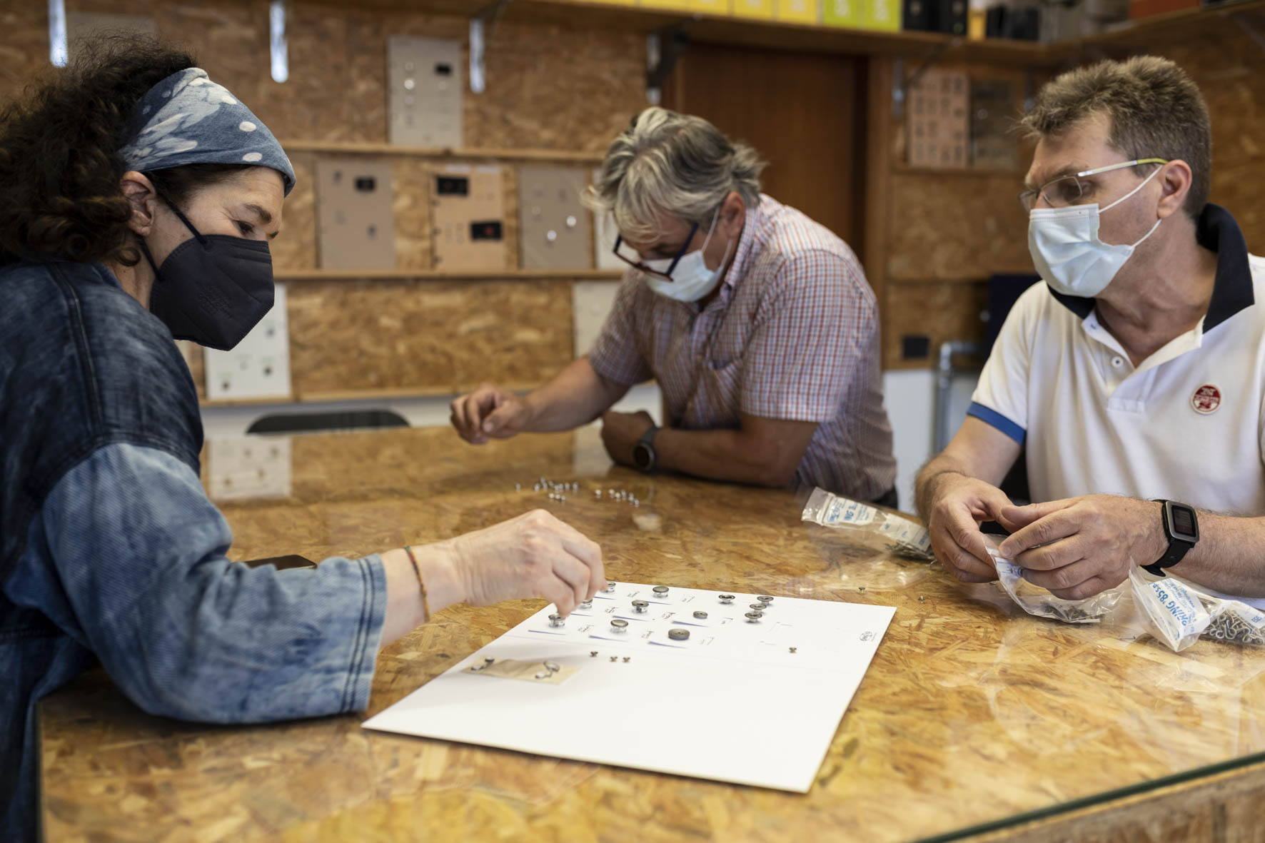 The Spring 85 supplying: Lucio Berto shows to us the steel buttons made in 100% re-use of “processing waste”. The cleaning and polishing are done through corncobs or wood sawdust, obtained from the waste of sawmill production discards.