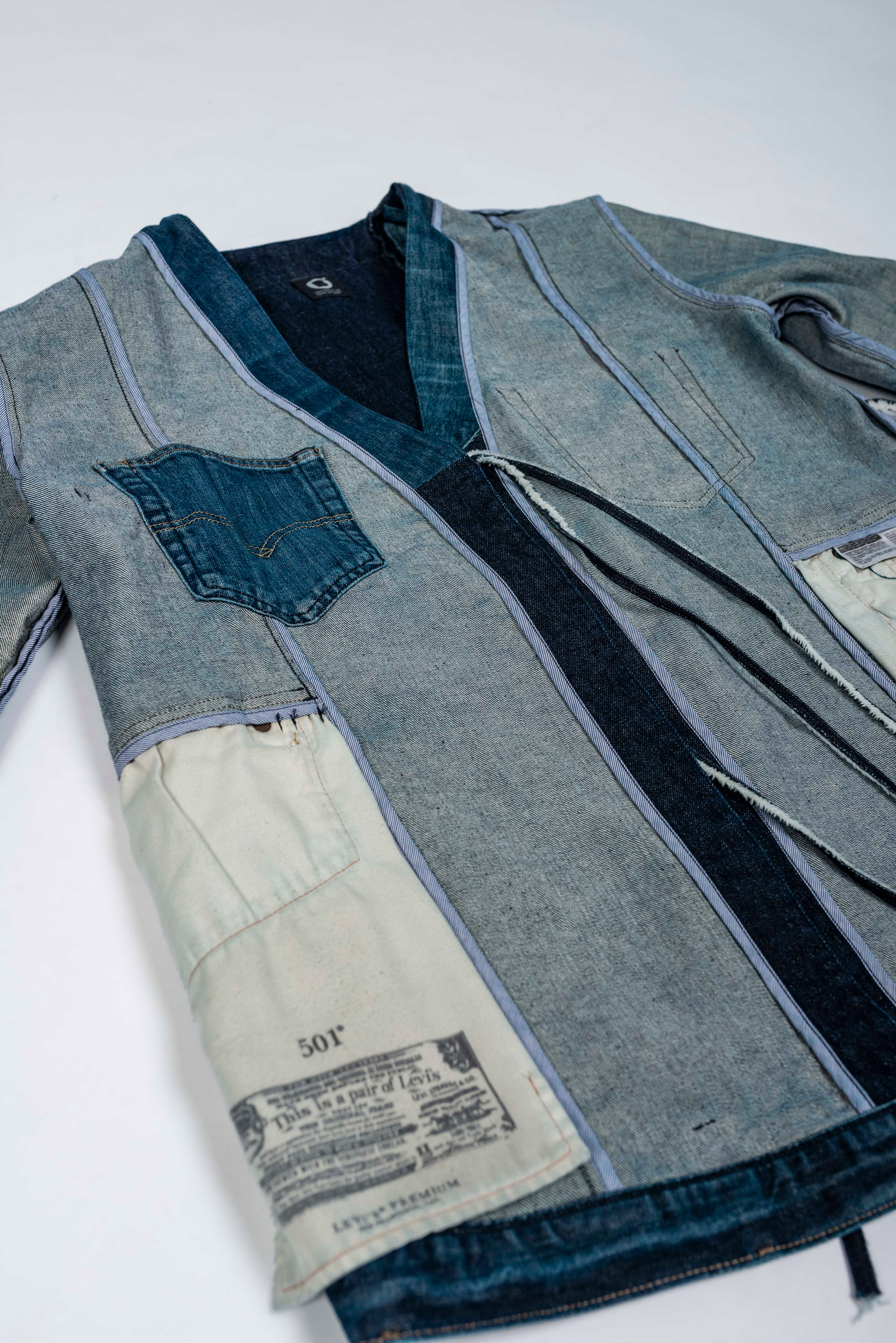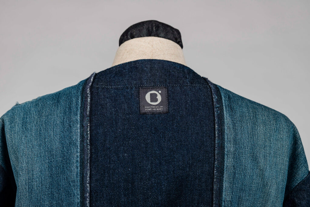The functionality and adaptable fit of the jacket are enhanced by the fusion of kimono and work jacket elements. To complete this outfit, an apron inspired by the 5 pocket jeans design, featuring a double side opening.