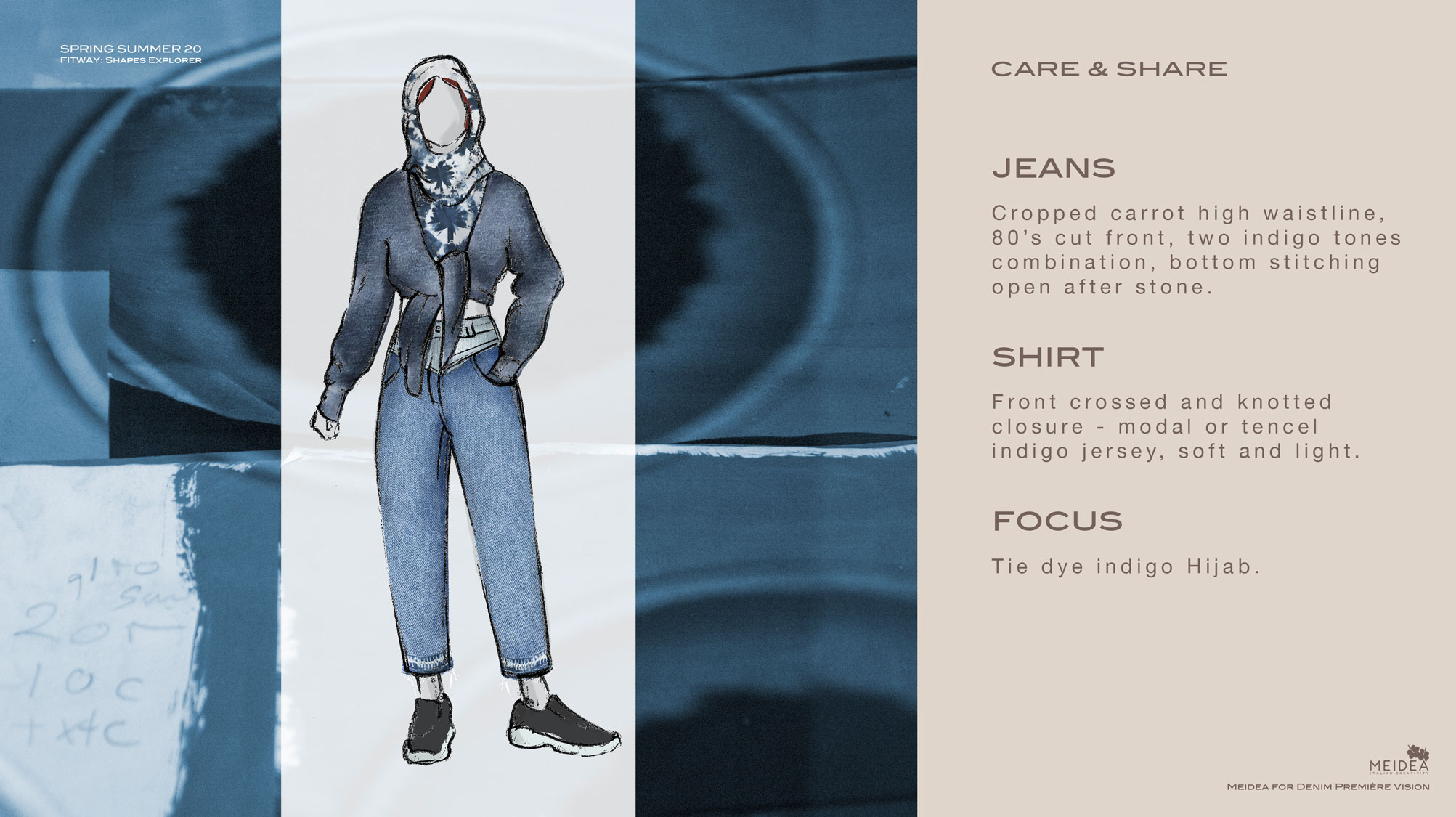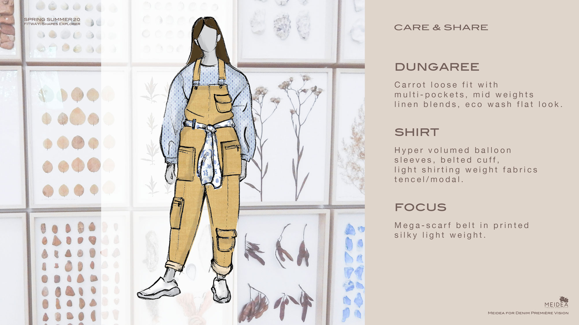 The outfits designed our team have been digitally edit in illustrations with the inclusion of fabric textures, details and finishes linked to the general concept in terms of aesthetics, concept and color. During this seminar on the denim trends for spring/summer 2020 season, Lucia Rosin presented each outfit divided into 4 main themes: CARE & SHARE, DISCOVER, PERFORMANCE, PERSONALIZATION. Each outfit is accompanied by keywords, mood and photos from the Meidea archive.