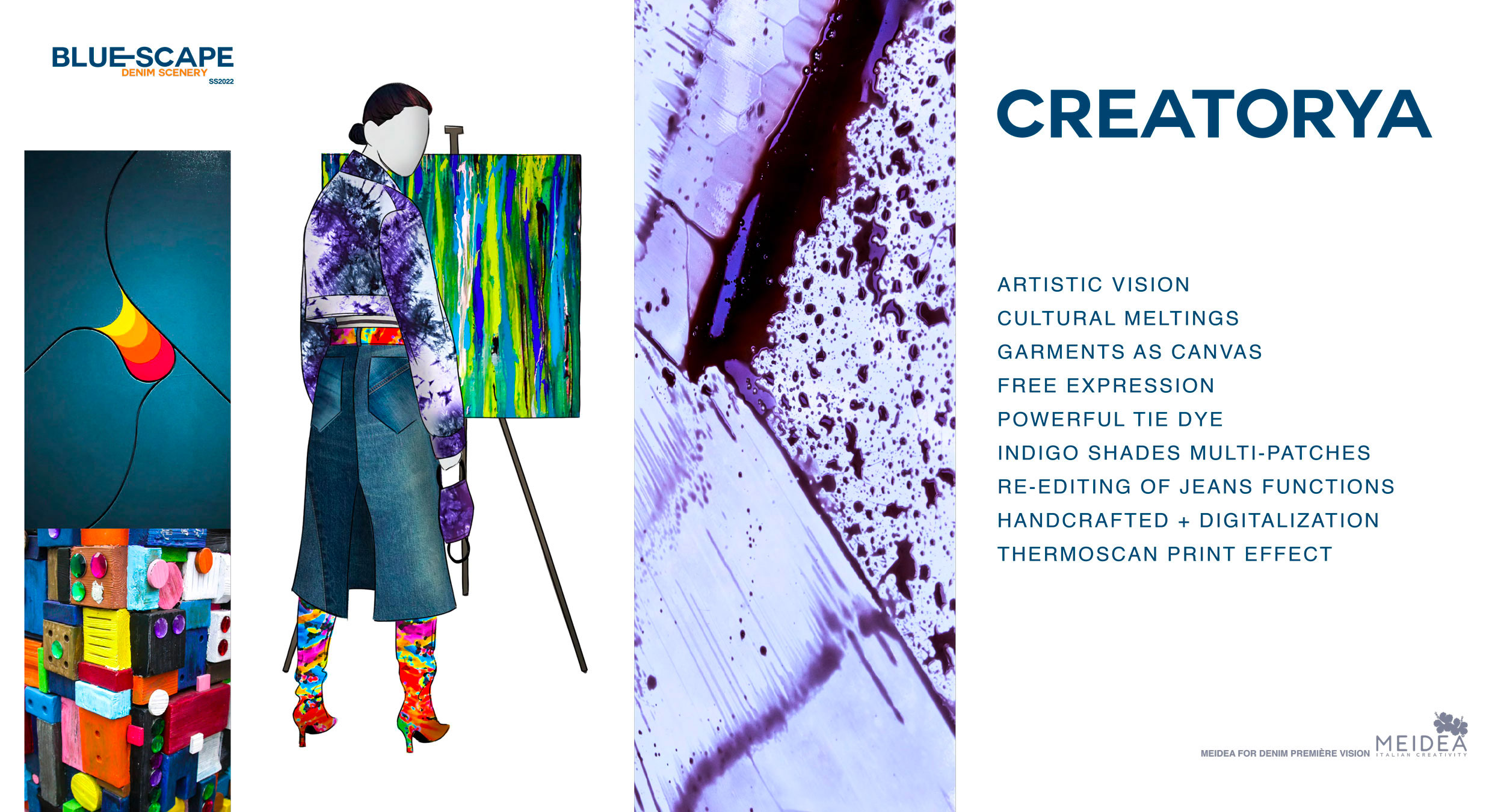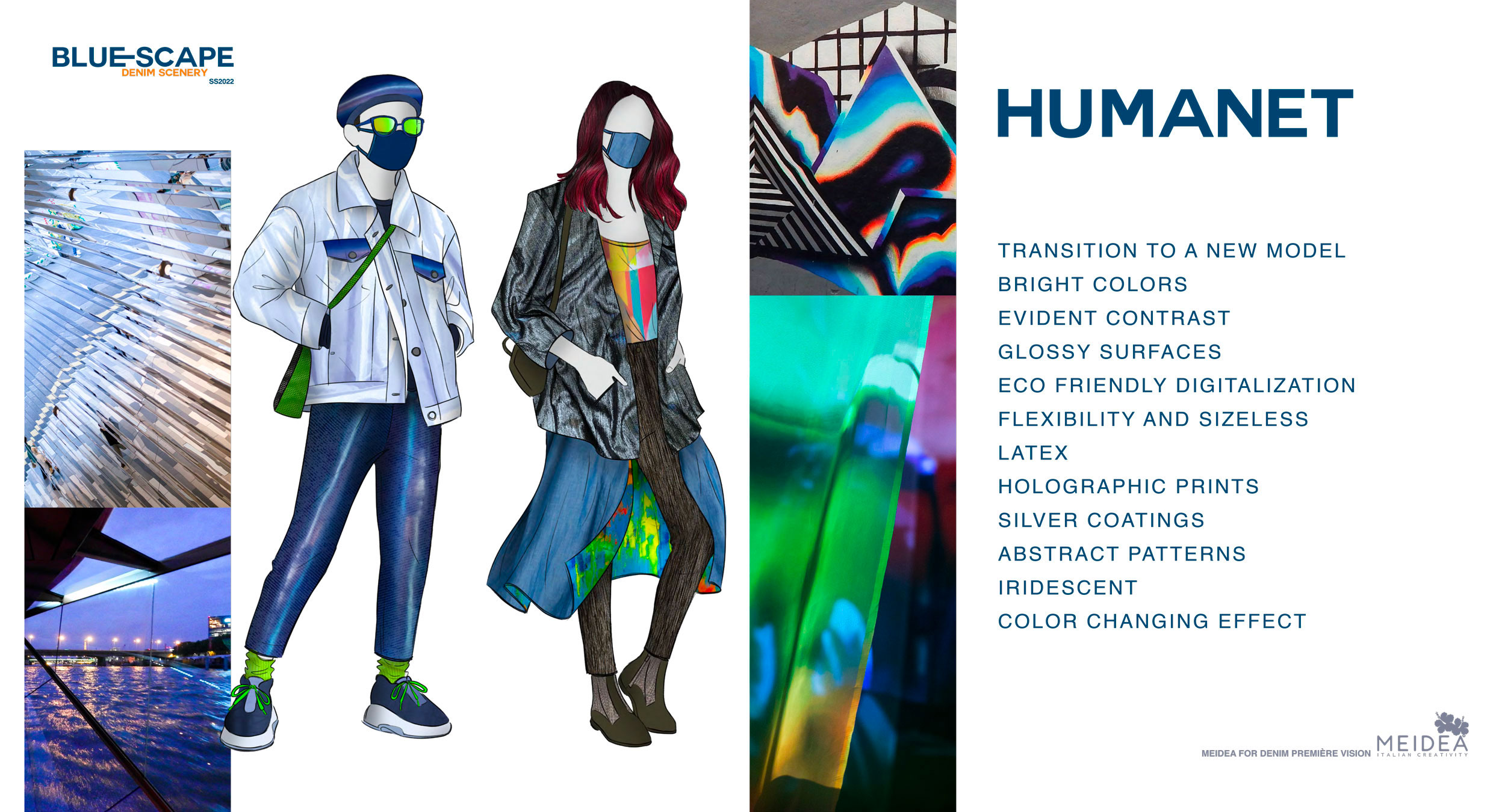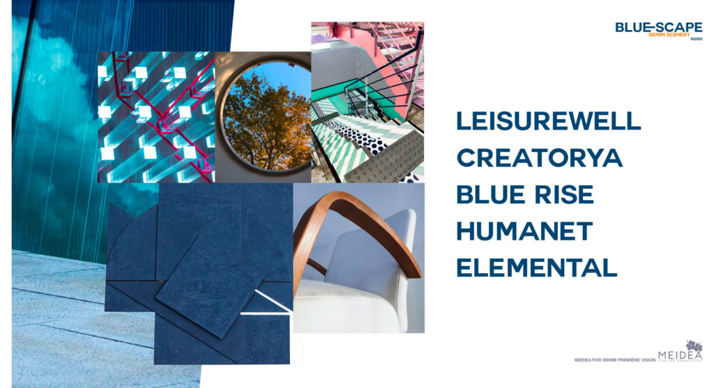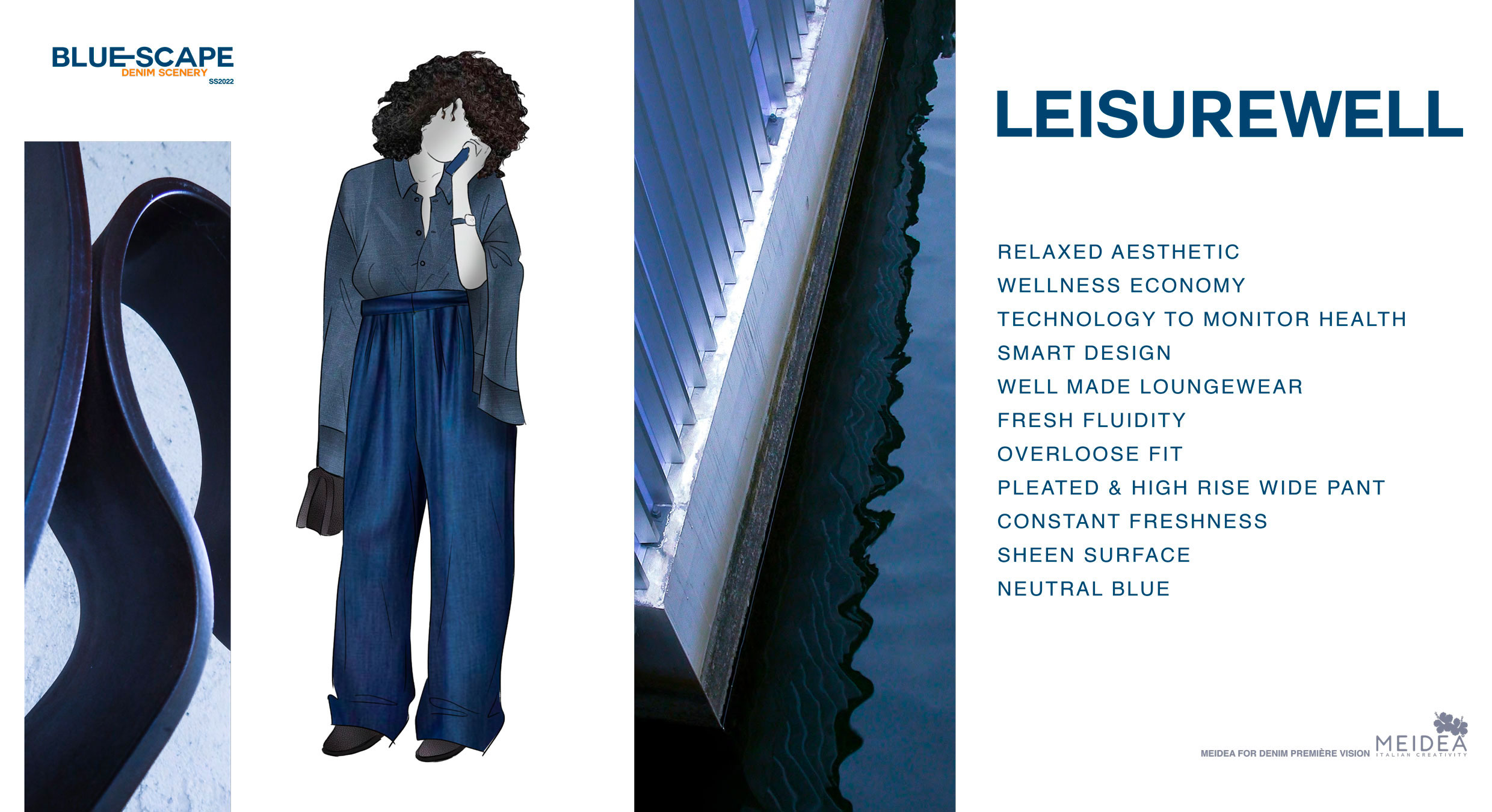 In this experience, the Meidea team expressed the main guidelines for outfits and silhouettes of Spring Summer 2022 season. Future denim trends in BLUE-SCAPE are expressed through 5 fundamental themes linked to contemporary lifestyles: Leisurewell, Creatorya, Blue Rise, Humanet, Elemental. Each mood board is matched with the keywords that identify its style inspirations and it is completed by the selection of outfits hand-drawn and digitized by our staff, with photos, textures and details of our travels and archives.
