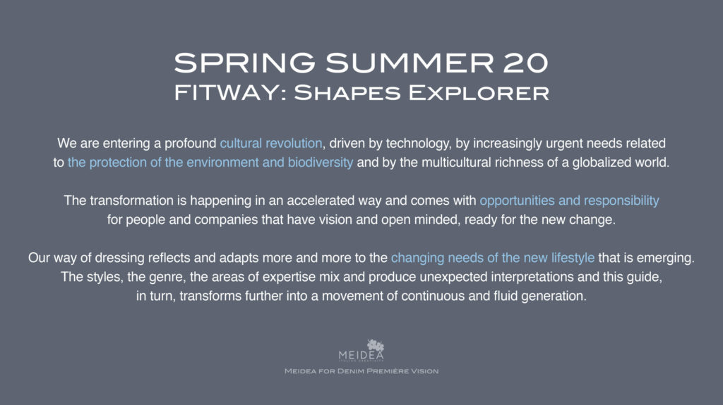 Meidea worked in synchrony with the Denim Première Vision team at every stage of development to be aligned in the general macro trends, color charts and keywords to be integrated into the trend seminars developed during these 3 years of teamwork.