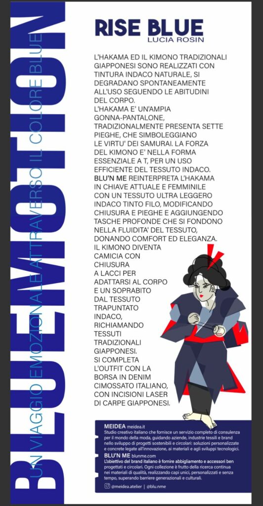 Il brand BLU’N ME reinterpreta la hakama in chiave attuale e femminile con un tessuto ultra leggero indaco tinto filo, modificando chiusura e pieghe e aggiungendo tasche profonde che si fondono nella fluidità del tessuto, donando comfort ed estrema eleganza. Il kimono diventa camicia con chiusura a lacci per adattarsi al corpo e un soprabito dal tessuto trapuntato indaco, richiamando i tessuti tradizionali giapponesi. Si completa l’outfit con la borsa in denim cimossato italiano, con incisioni laser di carpe giapponesi.
